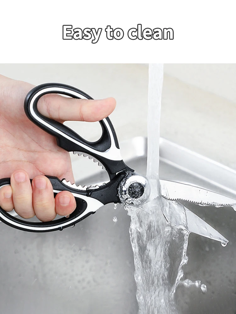 Tesoura multiuso feito em aço inoxidável que pode te auxiliar desde o corte de carnes até abertura de pequenos objetos metálicos.